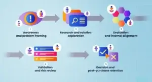 For a $30K to $100K annual contract, expect 3 to 6 stakeholders: an economic buyer (CFO or CEO), a champion (VP Sales or Head of Marketing), end users, and a technical evaluator.